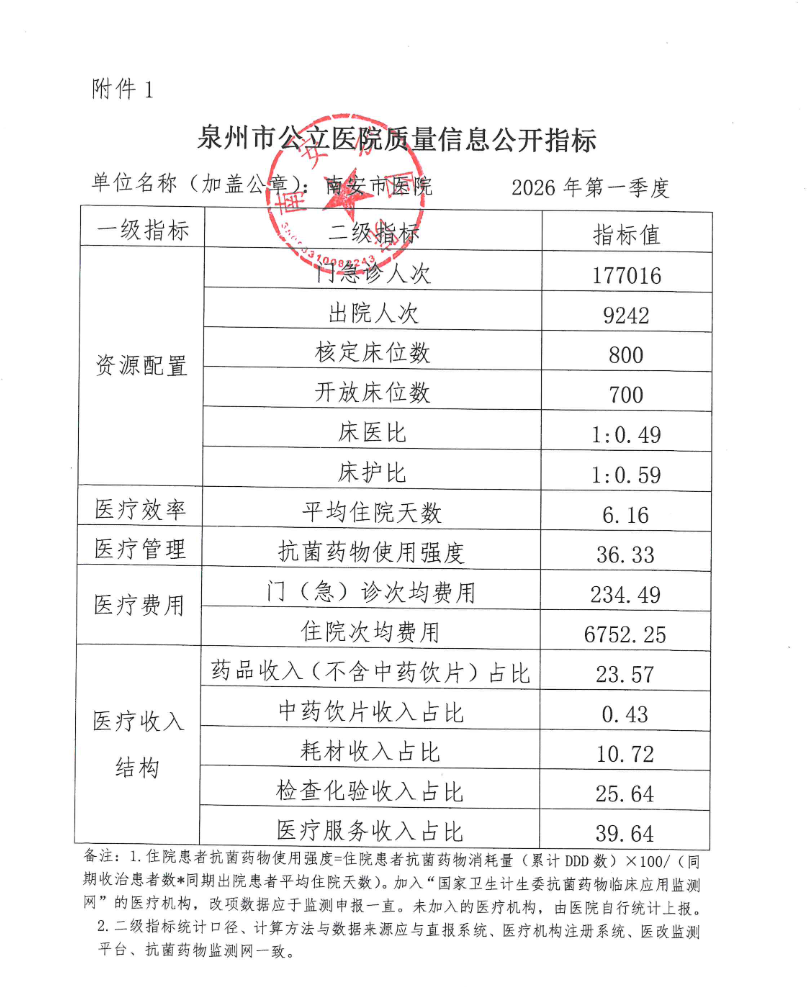 泉州市公立医院质量信息公开指标(2026年第一季度)